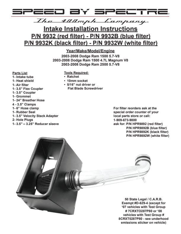 Spectre air intake systems are designed to get more horsepower and torque from your vehicle while working to protect your engine from harmful debris. They come with a blue Spectre air filter, aluminum tube and hardware.